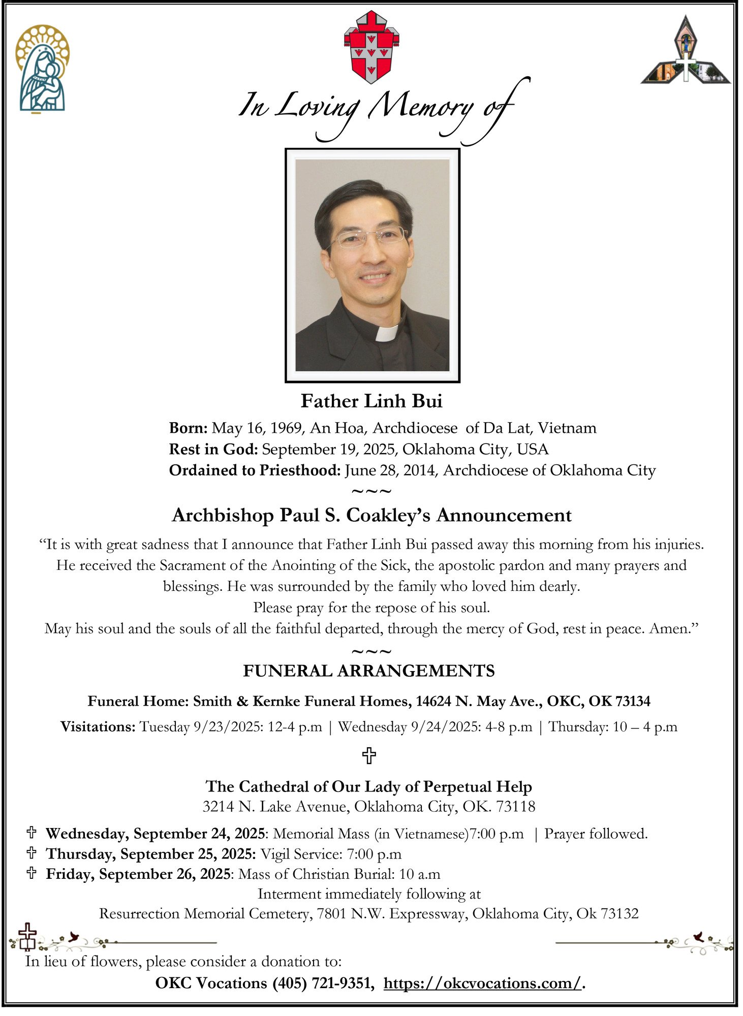 Funeral arrangements for Father Linh Bui: