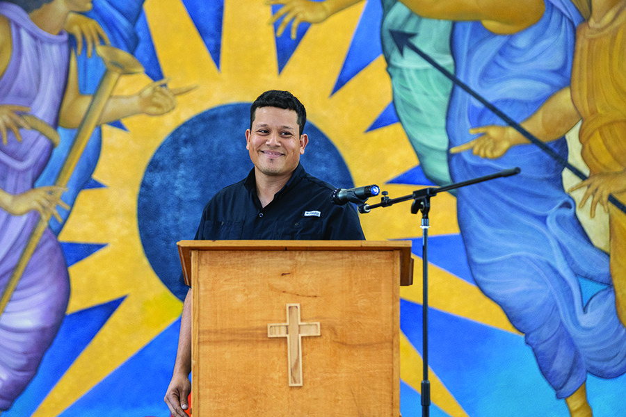 Photo: (Above) Miguel Escobedo spoke to guests at the grand opening of the Holy Angels Education Center on Aug. 20 in Oklahoma City. Photos Chris Porter/Sooner Catholic. Martin Rodriguez