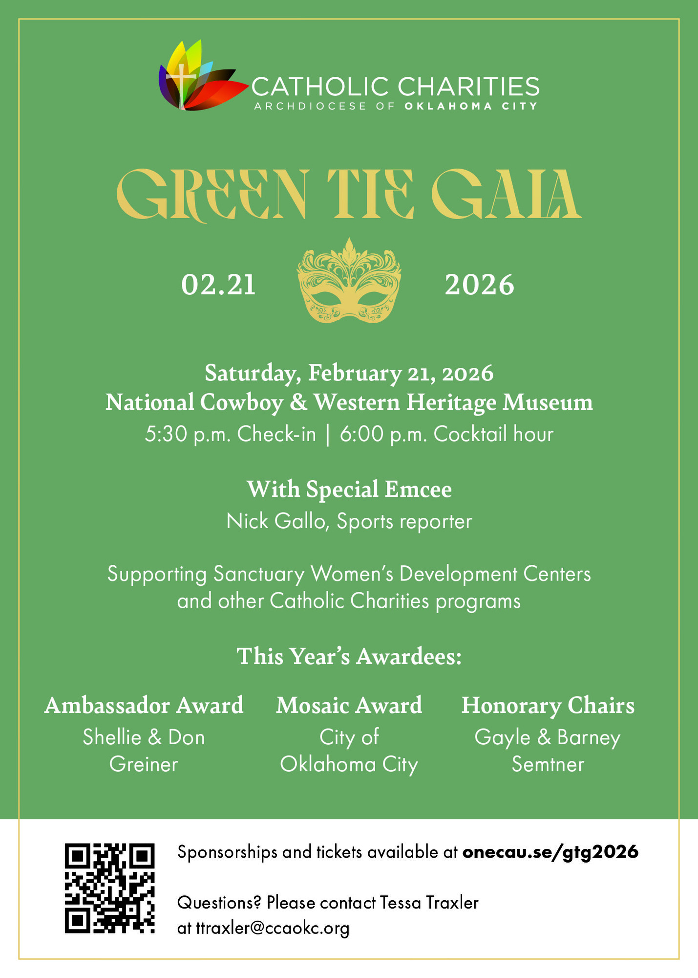 Catholic Charities of the Archdiocese of Oklahoma City will host its annual Green Tie Gala at 6 p.m. Feb. 21 at the National Cowboy & Western Heritage Museum, 1700 NE 63 St. in Oklahoma City. The gala supports the Sanctuary Women’s Development Centers. Visit catholiccharitiesok.org.