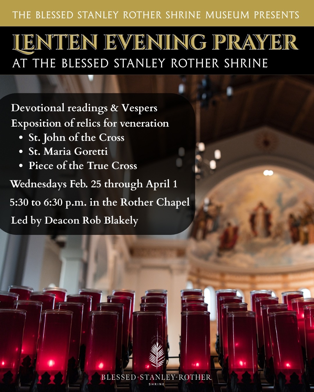 The Bl. Stanley Rother Shrine Museum presents Lenten evening vespers and relic expositions with Dcn. Rob Blakely from 5:30 to 6:30 p.m. every Wednesday until April 1 in the shrine chapel, 700 SE 89 St. in Oklahoma City.