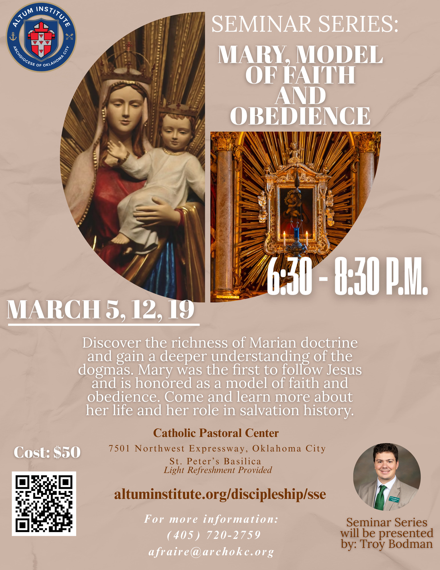 The Altum Institute will present a Seminar Series – Mary, model of faith and obedience 6:30-8:30 p.m. March 5, 12 and 19 in the St. Peter’s Basilica room at the Catholic Pastoral Center, 7501 Northwest Expressway in Oklahoma City. The presenter is Troy Bodman. Cost $50. Visit altuminstitute.org/discipleship/sse. Contact (405) 720-2759; [email protected].