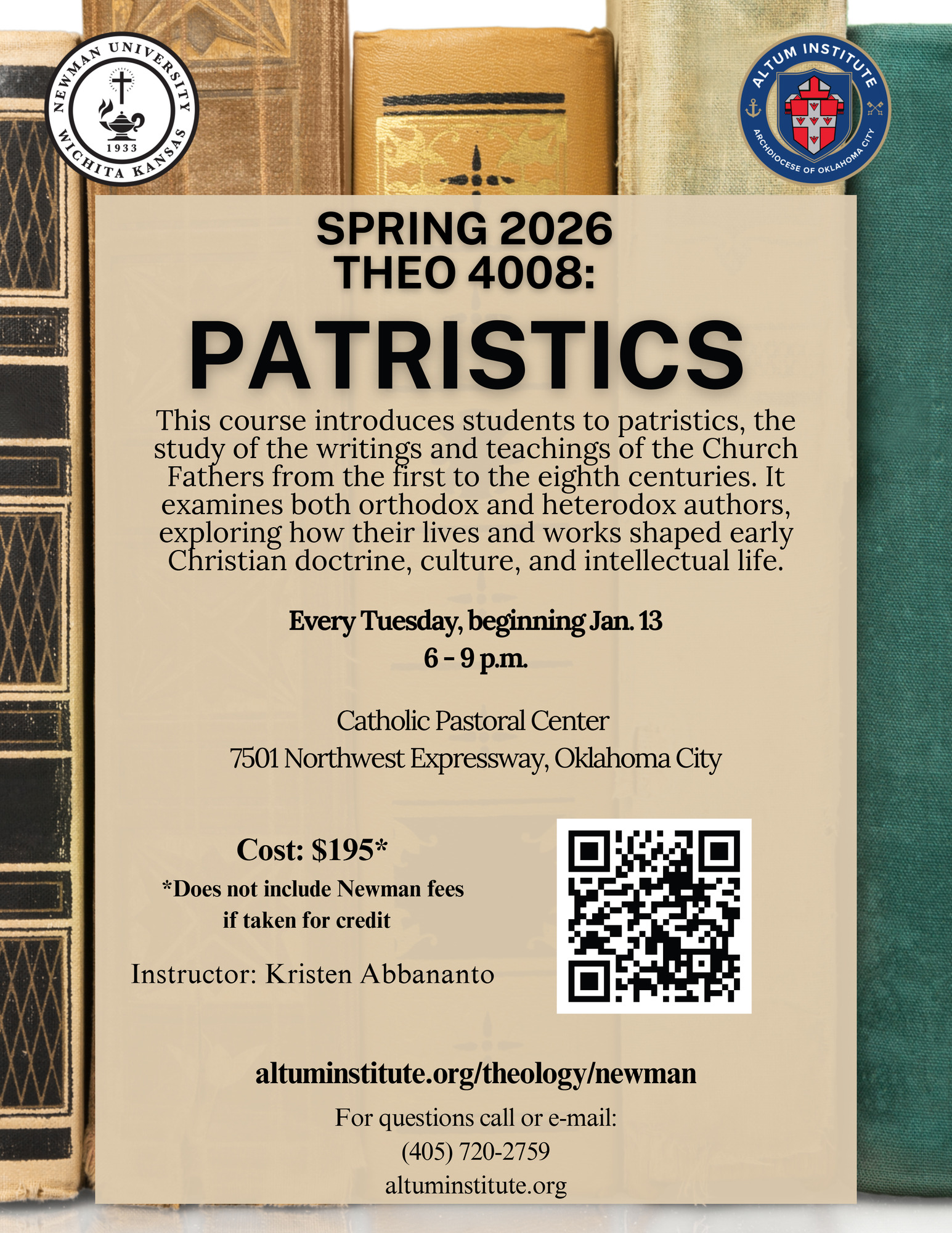 The Altum Institute and Newman University will also offer a patristics course 6-9 p.m. every Tuesday beginning Jan. 13 at the Catholic Pastoral Center. The instructor is Kristen Abbananto. Cost: $195 does not include Newman fees if taken for credit. Visit altuminstitute.org/theology/newman. Contact (405) 720-2759.