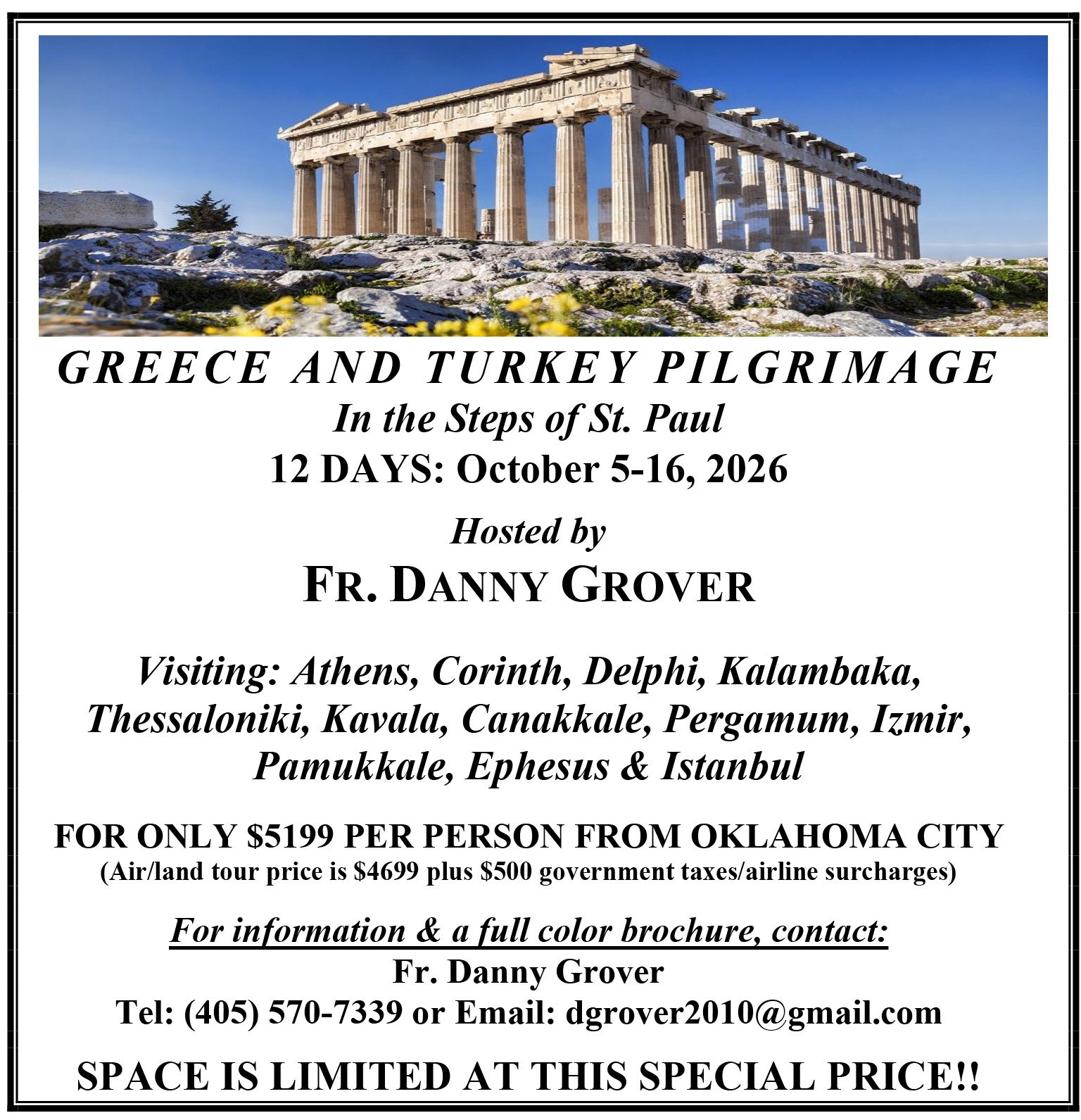 Greece, Turkey pilgrimage Join Fr. Danny Grover Oct. 5-16 on a pilgrimage to Greece and Turkey. Visit Athens, Corinth, Delphi, Kalambaka, Thessaloniki, Kavala, Canakkale, Pergamum, Izmir, Pamukkale, Ephesus and Istanbul. Cost: $5,199 per person from Oklahoma City. Space is limited at this special price. Contact Fr. Danny at (405) 570-7339 or [email protected].