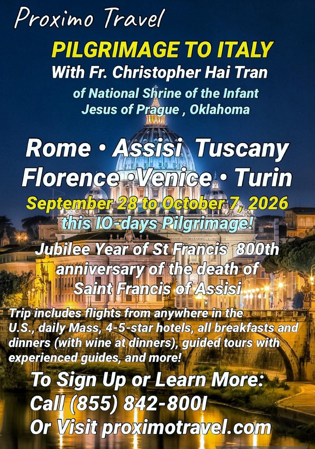 Italy pilgrimage Travel with Fr. Christopher Hai Tran, of National Shrine of the Infant Jesus of Prague, Prague, Oklahoma on our Pilgrimage to Italy tour. To mark the 800th anniversary of the death of Saint Francis of Assisi (Oct. 3, 1226), the Church has proclaimed a Special Year of Saint Francis from Jan. 10, 2026, to Jan. 10, 2027. Meeting Pope Leo XIV at a Wednesday General Audience in Saint Peter's Square or the Paul VI Hall. Travel to Turin to visit the shroud of Turin. The Shroud of Turin is a great symbol of faith and hope. The image of the Shroud directly evokes the Passion and Resurrection of Christ. This is just one of the highlights; there are many other places as well.